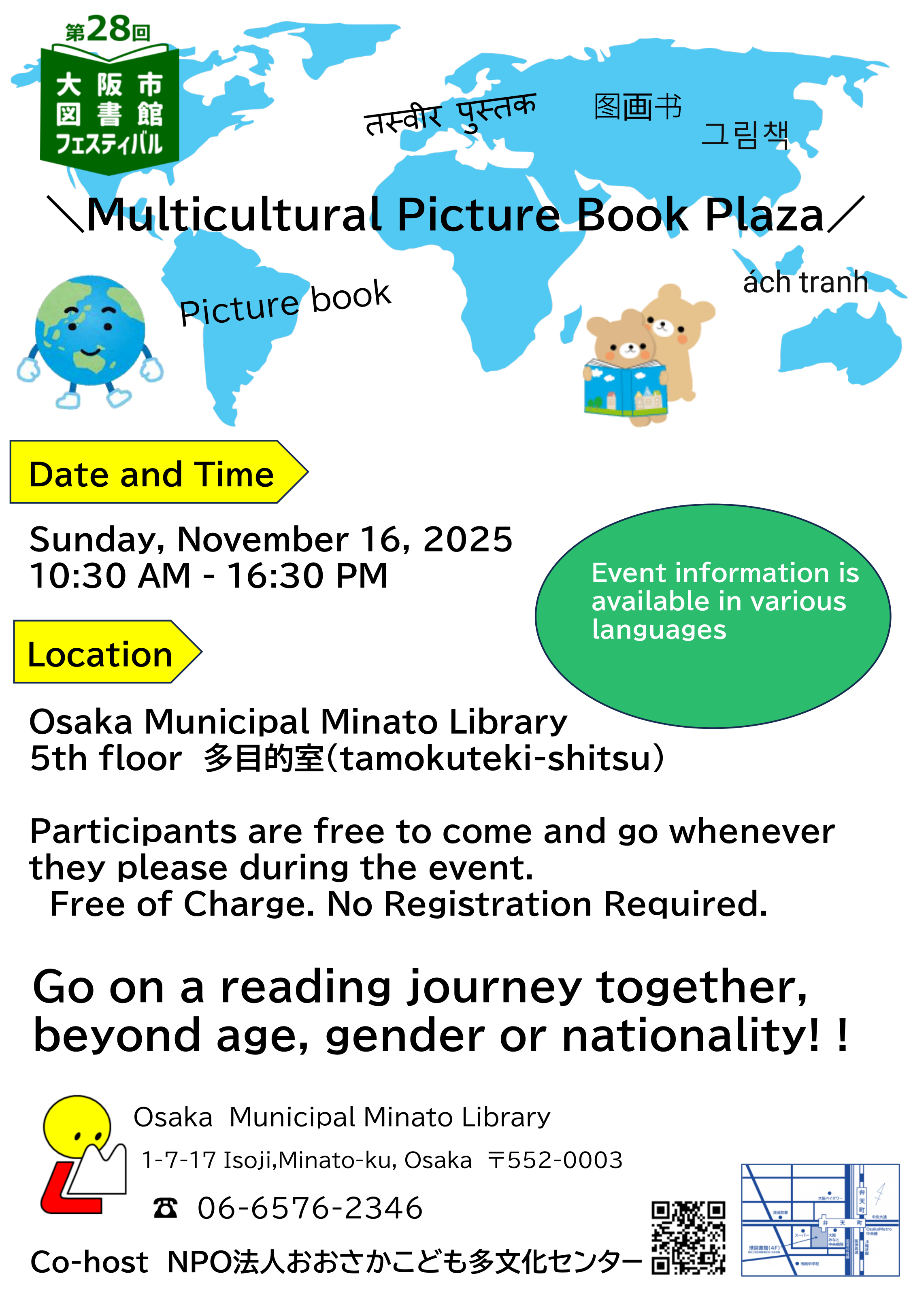 「多言語おはなし会」1)11:00-11:30、2)15:00-15:30